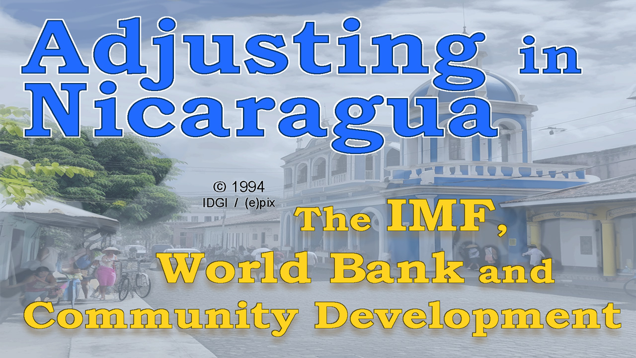Adjusting in Nicaragua: the IMF, World Bank and Community Development Sister-City projects empower local communities to stand for themselves amid harsh Structural Adjustments by The International Monetary Fund (IMF) and World Bank. This video was recorded on location in Nicaragua (Managua, Teustepe, Alta Gracia, Ometepe Island) and Washington, DC, in 1994. Post-production at Athens Center for Film and Video (Athens, OH) in 1994. Broadcast on WOUB (PBS affiliate) January 13, 1995. |